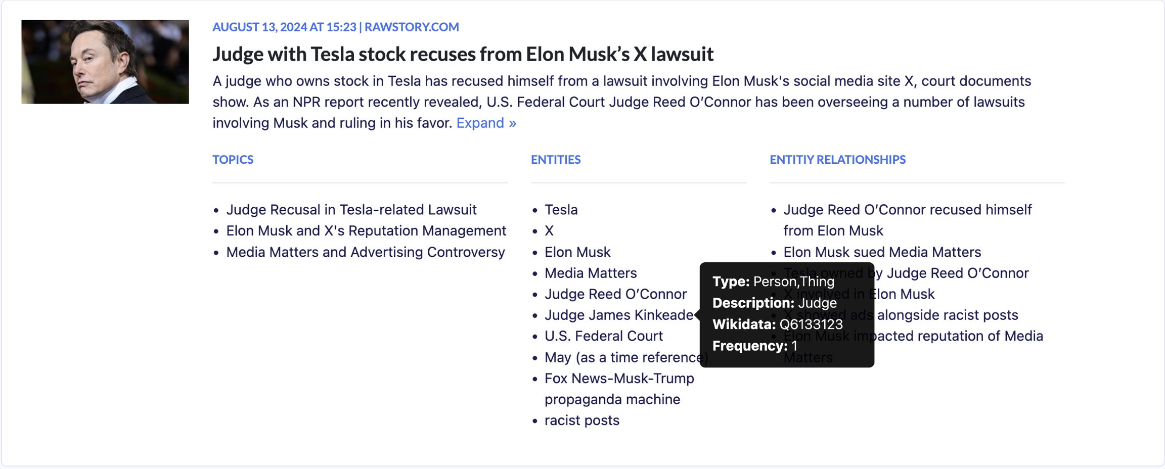 Clicking 'expand' on an article will reveal any entities, relationships and topics extracted from the article. Hovering over an entity will reveal a description, matching wikidata id, and number of times it was mentioned in the article.